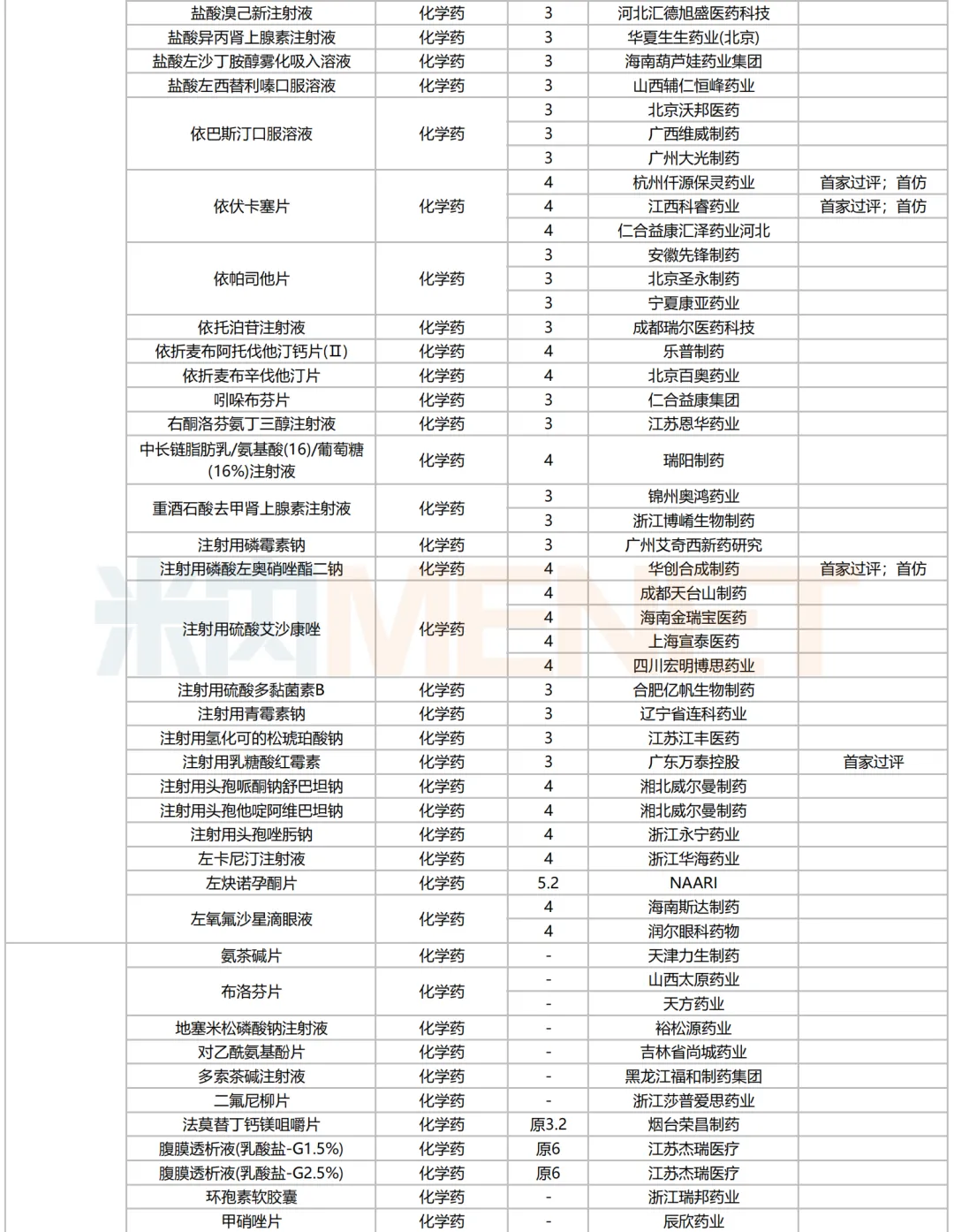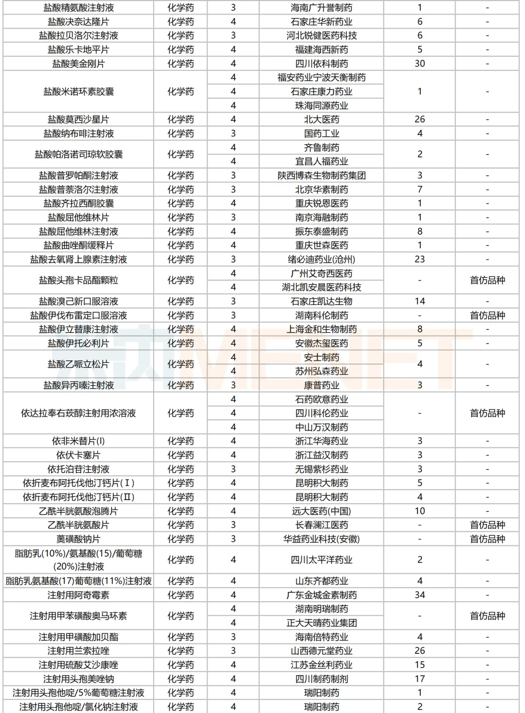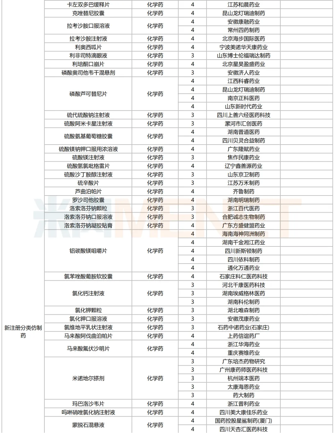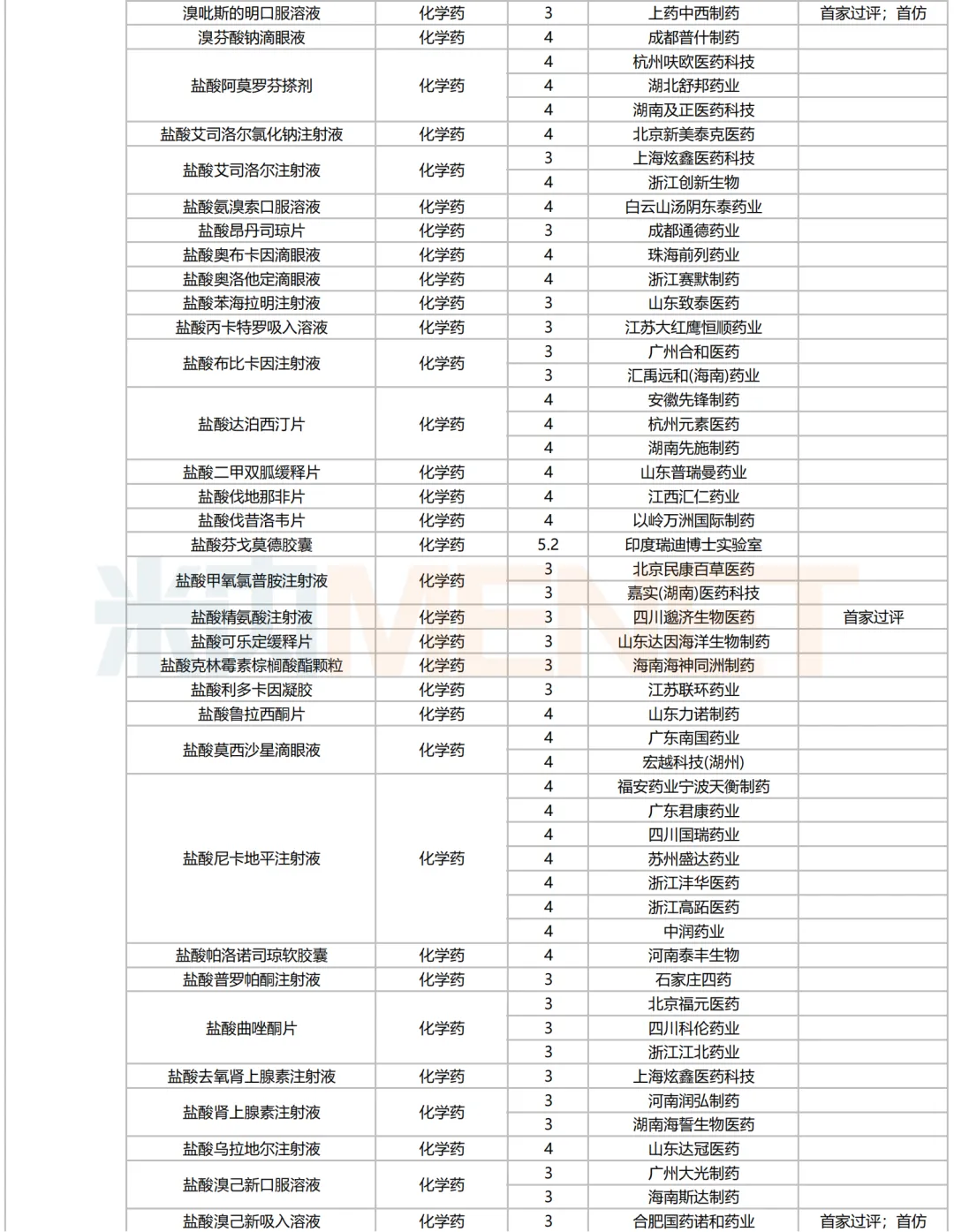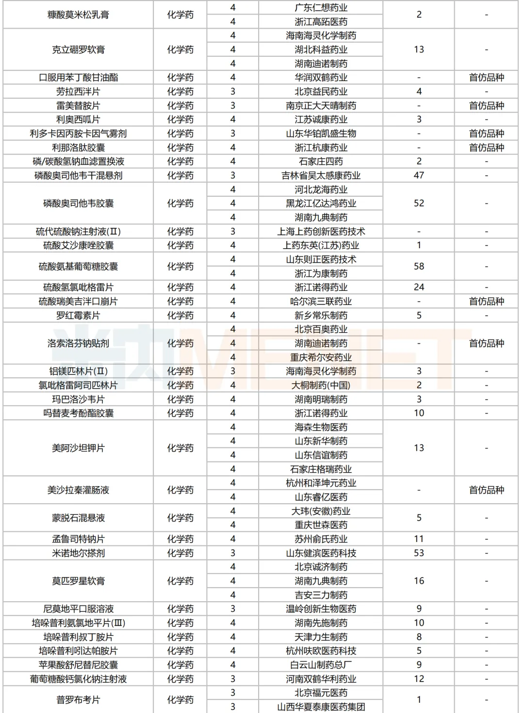 212个品种按新分类仿制申请获批并视同过评,29个品种按存量品种一致性评价补充申请过评。其中12个品种为首家过评。阿齐沙坦氨氯地平片(上海汇伦医药)、苯磺酸氨氯地平口崩片(广东万泰控股)、布瑞哌唑口崩片(齐鲁制药)、头孢托仑匹酯片(福安药业庆余堂制药)、妥洛特罗贴剂(北京泰德制药)、溴吡斯的明口服溶液(上药中西制药)、盐酸溴己新吸入溶液(合肥国药诺和药业)、依伏卡塞片(杭州仟源保灵药业、江西科睿药业)、注射用磷酸左奥硝唑酯二钠(华创合成制药)等9个品种为首仿品种。