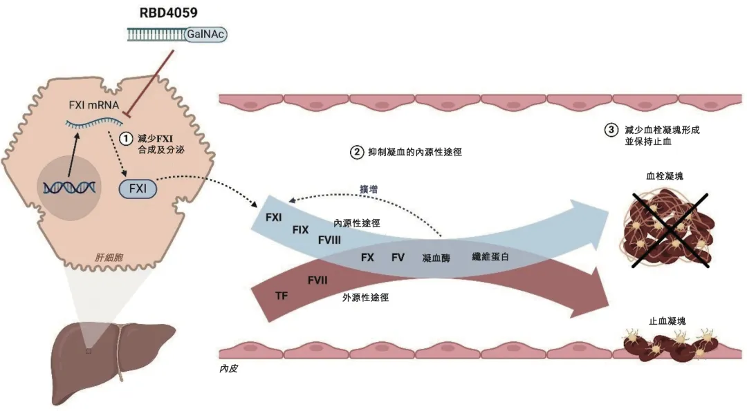 Vortosiran(RBD4059)是全球首个进入临床阶段用于治疗血栓疾病的 FXI siRNA,基于瑞博生物自主研发的RiboGalSTAR™肝靶向技术平台开发,通过特异性抑制FXI表达、阻断内源性凝血途径激活,实现精准抗凝与抗血栓作用,具有同类首创潜力。