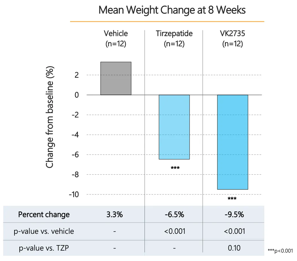 它的 VK2735 管线在II期临床中13周内实现减重14.7%,而且没有平台期,相比下Wegovy 达到15%的效果需要整整68周;甚至在 8