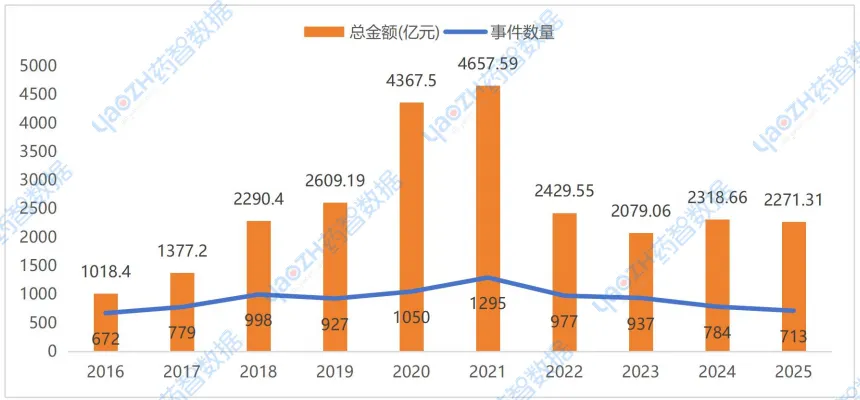 根据药智数据不完全统计,2016-2025年全球药品行业投融资趋势与全球医疗健康行业投融资趋势保持一致,2025年全球药品行业在一级市场共发生融资事件713起(同比下降9.06%),累计融资金额2271.31亿元(同比下降2.04%)。不管从融资事件还是融资金额来看,2025年全球药品行业的投融资活动都呈现出收缩状态,导致该现象的原因有很多,如整体市场资本供给不足、项目估值回调以及退出渠道收窄等。