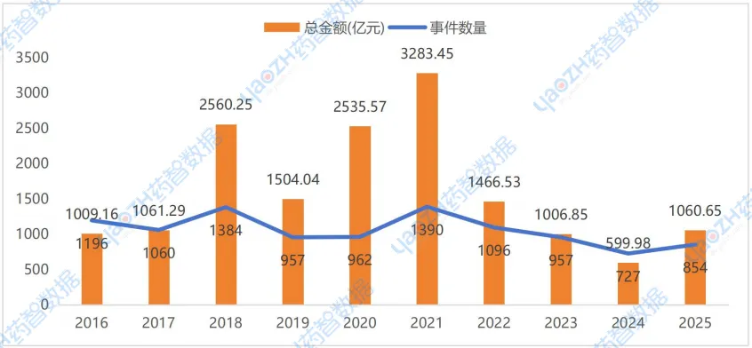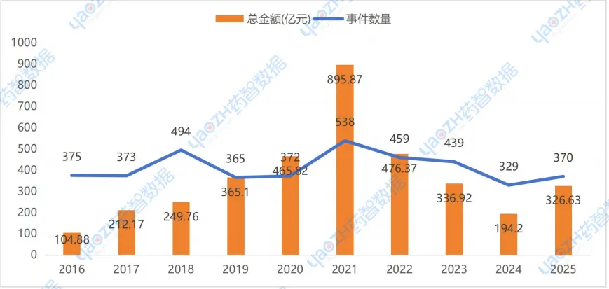 根据药智数据不完全统计,2016-2025年国内器械行业的投融资趋势与药品行业相仿,2021-2024年国内器械行业市场融资持续下滑,直至2025年有所回升。2025年国内药品行业在一级市场共发生融资事件370起(同比上升12.5%,比国内药品多8起),累计融资金额326.63亿元(同比上升68.19%,比国内药品少328.67亿元),交易总规模已回升至2018至2023年间水平。