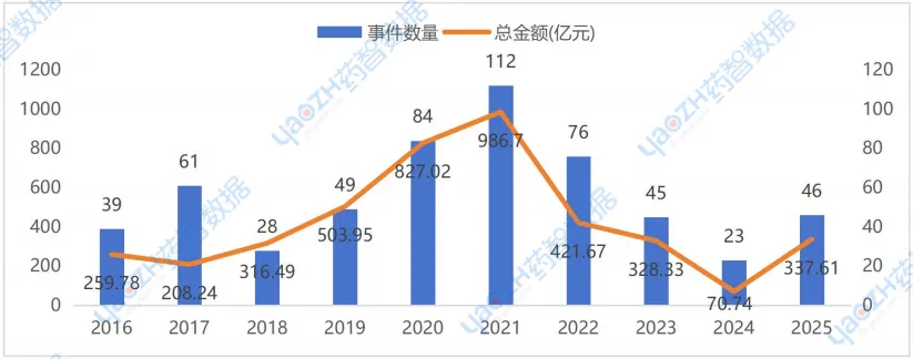 图5 2016-2025年国内医疗健康行业IPO事件及金额统计