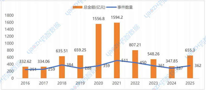 根据药智数据不完全统计,近十年国内药品行业的投融资趋势与全球药品行业投融资趋势基本一致,亦继2021年投融资事件量高峰后,国内药品行业市场融资持续下滑,直至2025年有所回升。2025年国内药品行业在一级市场共发生融资事件362起(同比上升26.13%,占比全球50.78%),累计融资金额655.3亿元(同比上升88.39%,占比全球28.85%),交易总规模已回升至2018至2019年间水平。