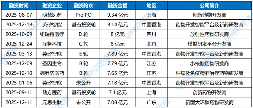 表1 2025年国内药品行业企业融资额TOP10