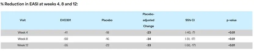 在第12周时,EVO301治疗组的湿疹面积和严重程度指数(EASI)较基线平均下降了55%,而安慰剂组仅下降了22%,两组之间的差异具有高度统计学意义(p<0.01)。这种显著的疗效在第4周和第8周时就已经显现,这表明药物起效迅速,且全程保持疗效。