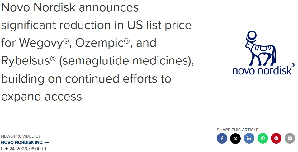2月24日,诺和诺德正式对外宣布,自2027 年1月1日起,将大幅下调美国的GLP-1药物官方标价(批发采购成本),其中Wegovy降幅度50%,Ozempic降幅约 35%,与Rybelsus的月度标价均统一降至 675 美元。
