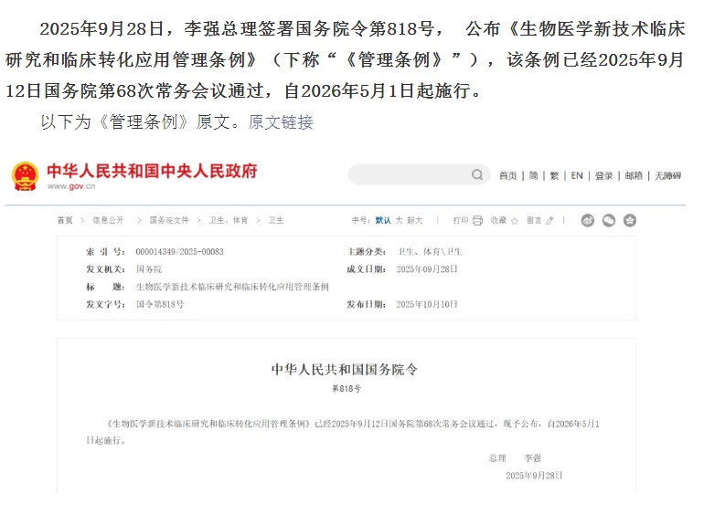 2025年9月,国务院审议通过《生物医学新技术临床研究和临床转化应用管理条例》(以下简称《条例》),将于今年5月1日起施行。这是我国首部关于生物医学新技术临床研究和临床转化应用的国务院行政法规,具有里程碑意义,标志着我国在该领域的监管步入法治化新阶段,对规范行业发展、守护安全底线,推动技术进步、产业发展和维护人民生命健康将发挥深远作用。