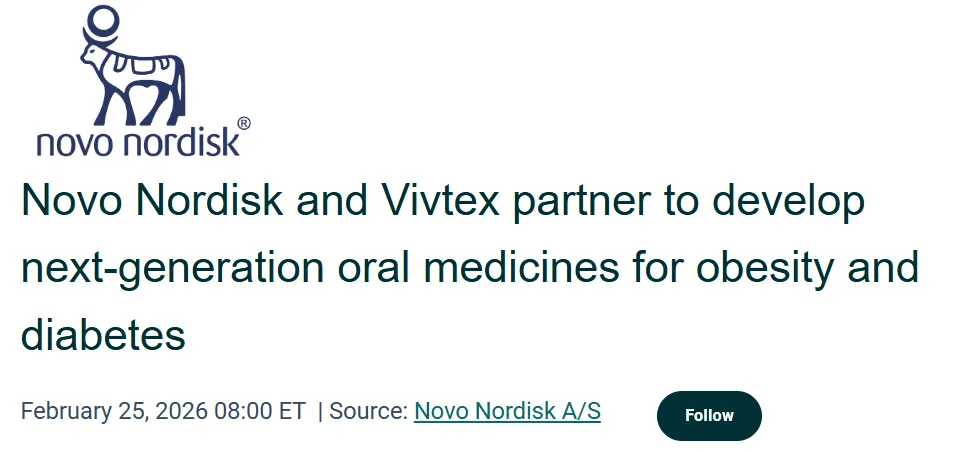 2 月 25 日,诺和诺德与Vivtex宣布建立合作关系,共同开发用于治疗肥胖、糖尿病及相关并发症的下一代口服生物制剂。