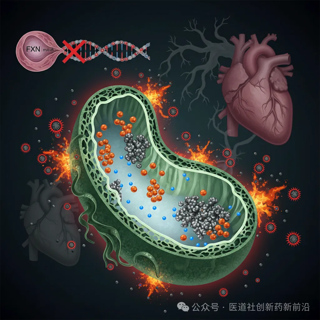 先说说FRDA的核心病理,这对临床医生和研发人员来说是基础,但也最容易被忽略的痛点。FRDA 97%的病例由FXN基因GAA三核苷酸重复扩增引起,导致转录阻滞,FXN蛋白产量锐减。FXN是一种核编码的线粒体蛋白:在细胞质合成后,通过N端线粒体靶向序列(MTS)导入线粒体,经线粒体加工肽酶(MPP)裂解成成熟形式(mFXN,约14kDa)。它的关键作用?调控铁硫簇(Fe-S cluster)生物合成,这是线粒体呼吸链酶(如琥珀酸脱氢酶)和柠檬酸循环酶(如异柠檬酸脱氢酶)的“prosthetic group”。缺了它,铁过载、氧化应激爆发、能量代谢崩溃,最终波及神经、心脏和骨骼系统。