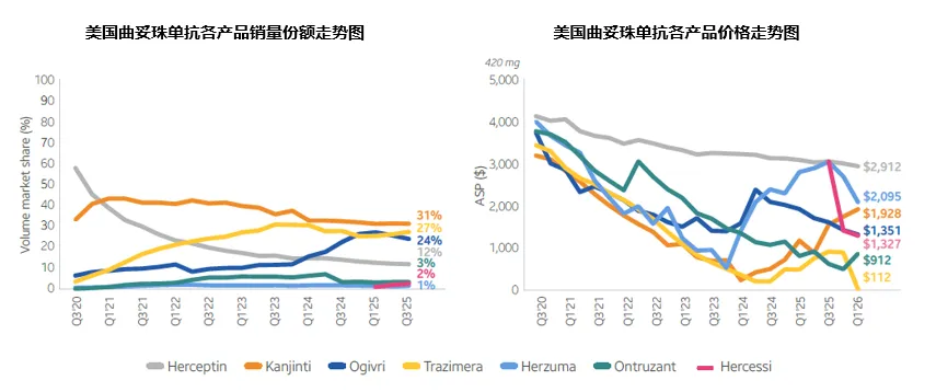 2025年,原研产品Herceptin美国市场销售继续下滑至2.25亿瑞士法郎(约合2.71亿美元),15%的降幅为近六年来最低,美国市场在全球收入中的占比由去年历史最低的19%提升至22%。随着Accord曲妥珠单抗生物类似Hercessi在去年年初的上市,美国曲妥珠单抗生物类似药此前多年五强争霸的格局被打破,竞争进一步加剧。全年生物类似药市场整体销量份额进一步提升至78%。2025年该产品的整体美国市场销量继续下滑至96.4万支(-4%),150mg和420mg两个规格产品的份额基本持平。2025年首仿产品Amgen的Kanjinti表现相对平稳,以31%的份额继续领跑生物类似药,其美国市场销售额在2024年跌破1亿美元后已不在年报中单独报告单品收入;相隔两个月上市的Biocon的二仿产品Ogivri和Pfizer的三仿产品Trazimera的全年份额均在20%左右,彼此之间的差距不大,Organon、Teva和Accord的三个生物类似药销量份额均未超过5%;在价格方面,Pfizer、Biocon和Celltrion三家均进行了大幅降价,Pfizer产品Trazimera的降幅达到了79%,降至2.66美元/10mg,为当前最低平均销售价格,相当于原研品价格的4%,原研产品Herceptin的平均销售价格小幅下降至69.3美元/10mg(-5%)。
