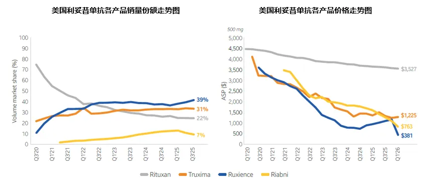 2025年,原研产品Rituxan美国市场销售收入为7.94亿瑞士法郎(约合9.57亿美元),相比2024年下滑了6%,占到了原研产品全球销售额的64%;利妥昔单抗生物类似药的全年整体销量占比进一步增加至81%,目前仍旧只有三家生物类似药在售。2025年该产品的整体美国市场销量约为230万支(+4%),相比上年略有提升,约54%的份额来自于100mg/10ml的小规格产品。作为比首仿产品晚两个月上市的二仿产品,Pfizer的Ruxience以38%的全年份额继续领跑,从2025年起不再单独进行销售额报告,Pfizer名下包括该产品在内的抗肿瘤生物类似药的2025年整体收入为9.14亿美元;Teva的首仿产品Truxima排名第二,其份额升至32%,于2021年最晚上市的Amgen的Riabni份额略微下滑至10%,与上年差别不大。在价格方面,Ruxience和Riabni的价格降幅均超过了50%,Ruxience其平均销售价格下降至7.6美元/10mg(-56%),仍为目前该产品的生物类似药最低价格,相当于原研品价格的11%,原研产品Rituxan的价格小幅下降至71美元/10mg(-5%)。