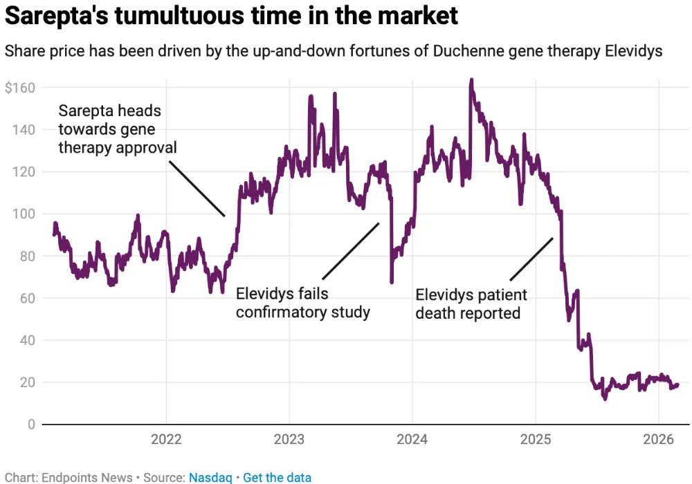 从年初到年底,Sarepta的股价跌幅超过80%,创下近十年最低点,市值较2024年高点蒸发约130亿美元。曾经被誉为“基因治疗神话”的Elevidys,一夜之间变成了烫手山芋。