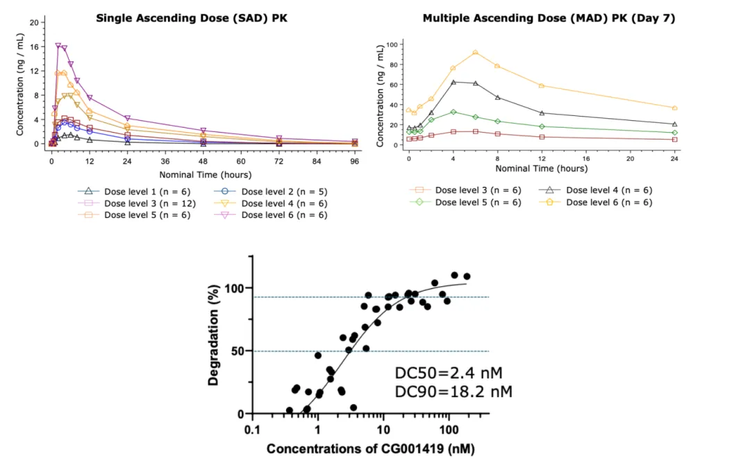 然后就是Cullgen的Protac分子了,其优先推进的管线是CG001419,靶向原肌球蛋白受体激酶 (TRK),首推适应症是镇痛。目前能看到临床I期的结果,其SAD和MAD阶段的PK曲线如下图所示。50%蛋白降解的分子浓度(DC50)为2.4nm,DC90为18.2nm。