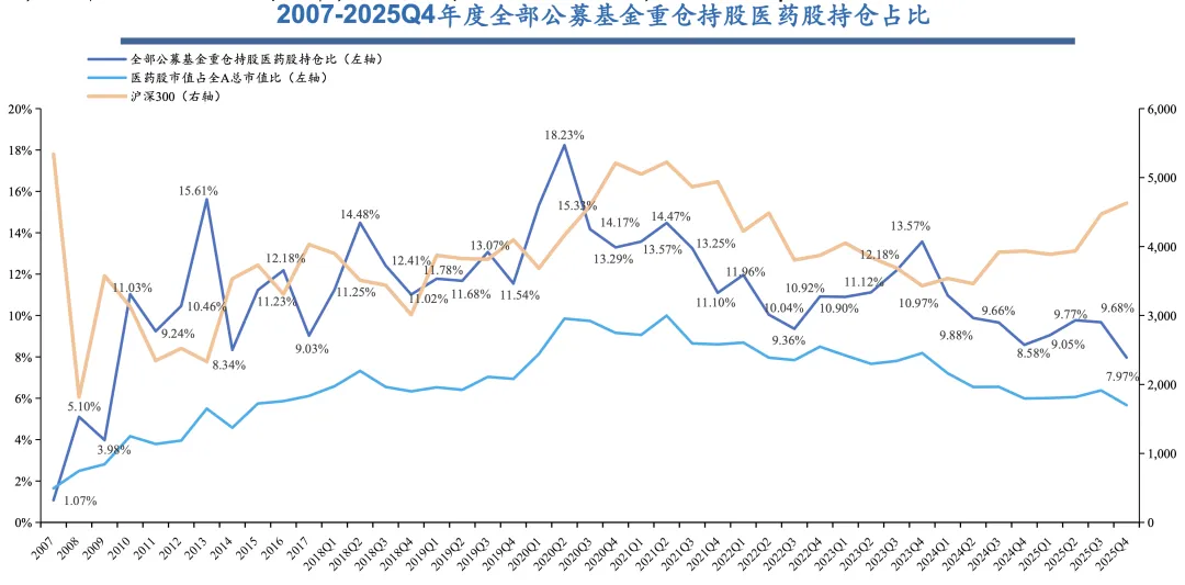 据华安证券,2025Q4,全部公募基金重仓持股中,医药股持仓占比为7.97%,环比-1.71pct,跌至近15年来最低点。