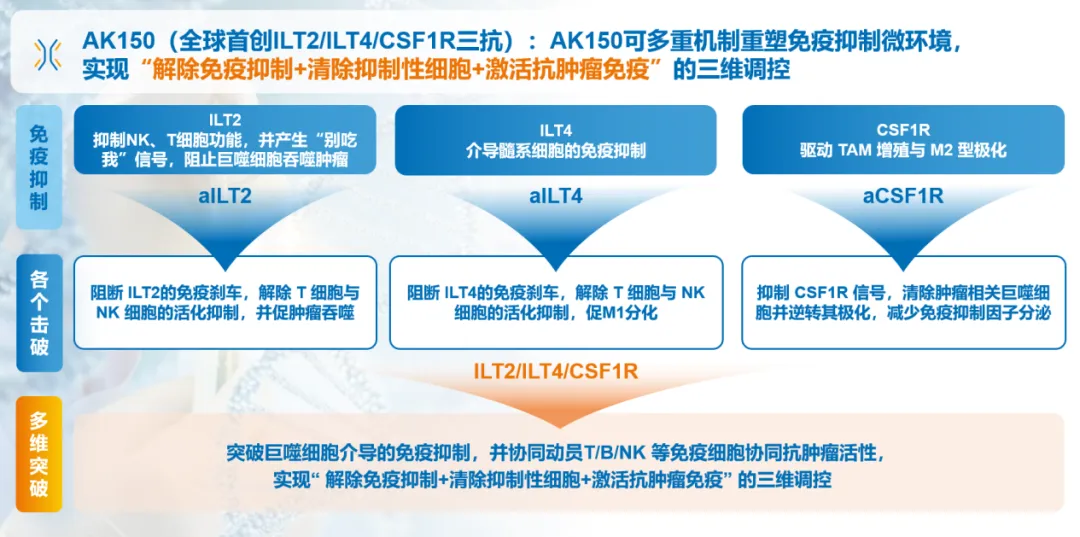 AK150同时靶向LILRB1、LILRB2和CSF1R三条关键通路,通过多重机制协同调控,形成一套针对巨噬细胞“重编程”的精密算法: