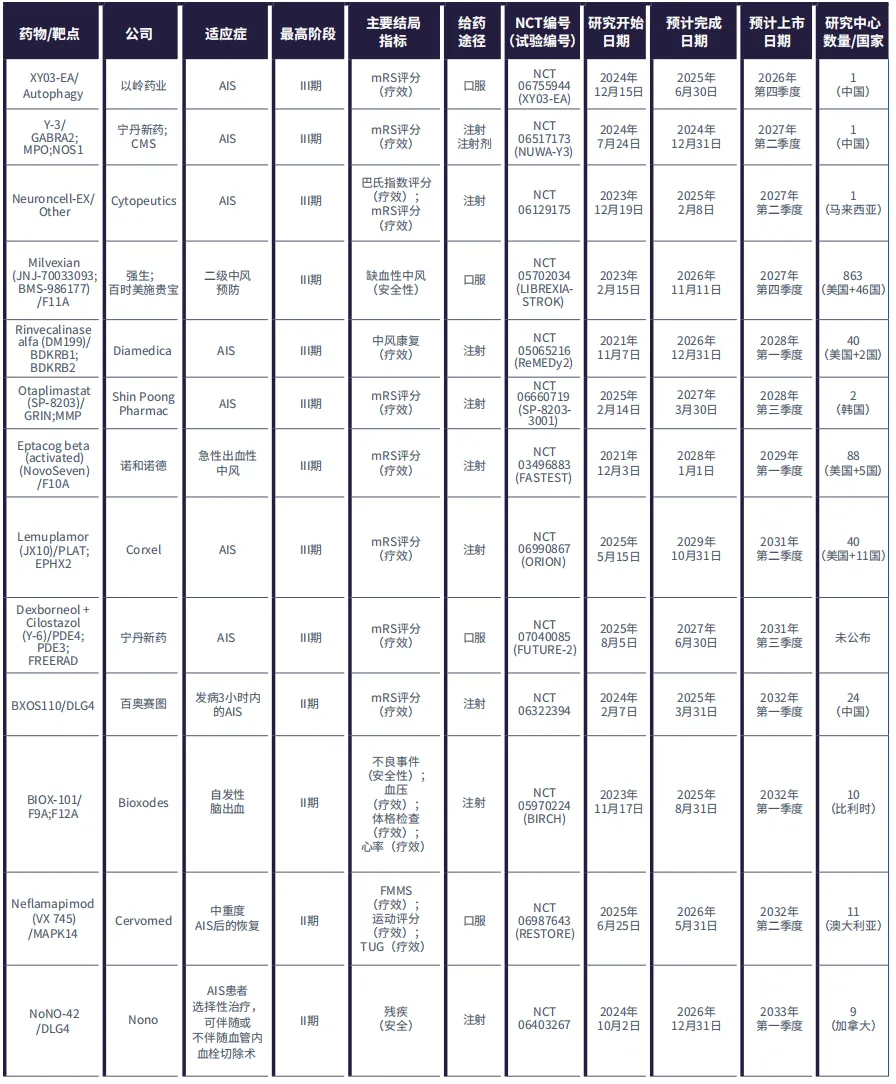 截至2025年11月,Trial Link平台列出了60项正在进行的中风临床试验(试验状态包括:招募中、进行中但不再新招募、尚未招募和仅限邀请入组),其中40项试验处于II期和III期阶段,部分试验列于下表。