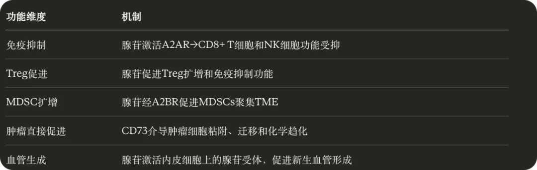 这就和我们此前遇到的那些免疫抑制靶点有相通之处了,因为免疫抑制,所以导致T细胞杀伤能力减弱。CD73在人类癌症中表达会升高,主要的原因在于肿瘤微环境的环境因素:肿瘤微环境(TME)中的低氧状态是CD73高表达的核心驱动因素,其中HIF-1α转录因子直接上调CD73和CD39的表达。而CD73就如图上文所说,通过腺苷来抑制免疫细胞活性——腺苷是一种强效免疫抑制分子,可有力抑制多种免疫细胞的增殖和功能,尤其是T细胞。