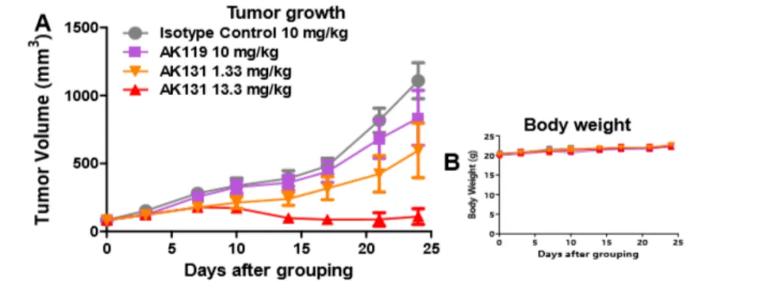 在携带MC38-hPDL1-hCD73异种移植物的C57BL/6-hPD-1/hPD-L1/hCD73转基因小鼠中观察AK131的体内抗肿瘤活性。研究显示,AK131可显著抑制肿瘤体积生长,具有强大的抗肿瘤活性,并且显著优于单抗AK119。