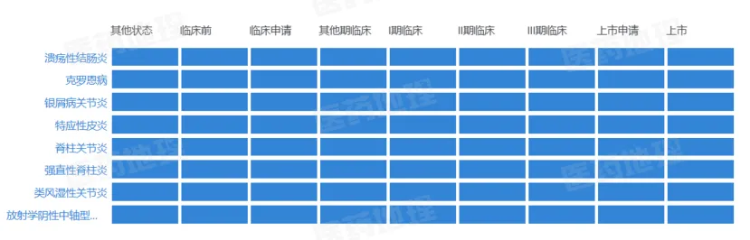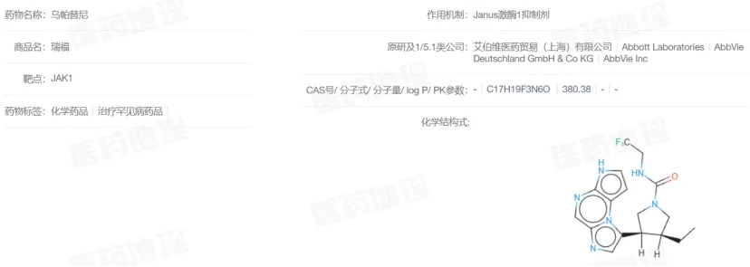 Pharma ONE药物研发大数据平台显示,目前乌帕替尼已在国内获批溃疡性结肠炎、克罗恩病、银屑病关节炎、特应性皮炎、强直性脊柱炎、类风湿关节炎等多项适应症。