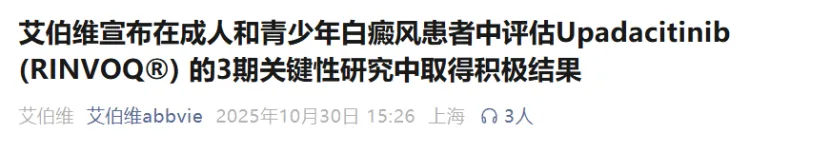 去年10月,艾伯维宣布乌帕替尼在成人和青少年白癜风患者中评估的3期关键性研究中取得积极结果。