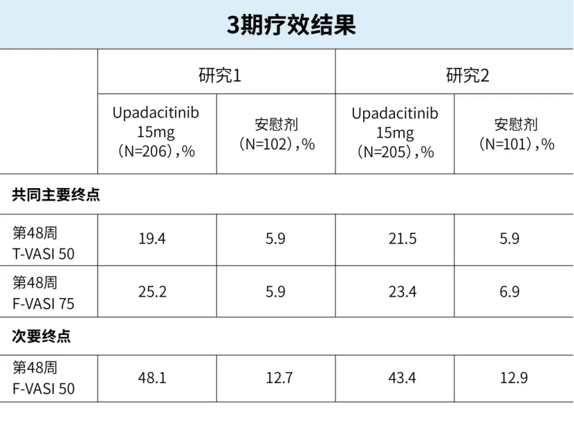 在两项研究中,约70%的受试者基线时的T-VASI>10。与安慰剂相比,upadacitinib在第48周达到了共同主要终点T-VASI 50(T-VASI评分较基线降低≥50%)和F-VASI 75(F-VASI评分较基线降低≥75%)。在两项研究中,在关键排序次要终点方面观察到upadacitinib与安慰剂存在统计学显著差异,包括第48周时的F-VASI 50。