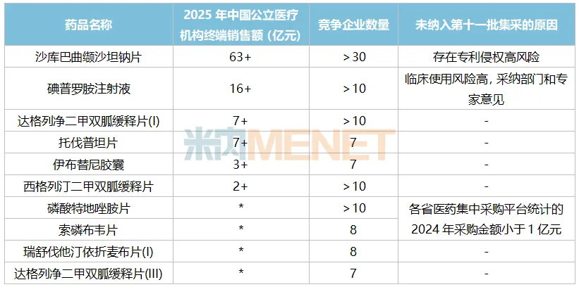 据统计,南京正大天晴制药有10个产品目前的竞争企业(原研+过评)在7家或以上且暂未纳入集采,其中沙库巴曲缬沙坦钠片和碘普罗胺注射液2025年在中国公立医疗机构终端的销售额分别高达63亿元、16亿元。第十二批集采最终会纳入哪些产品,我们静待官宣。