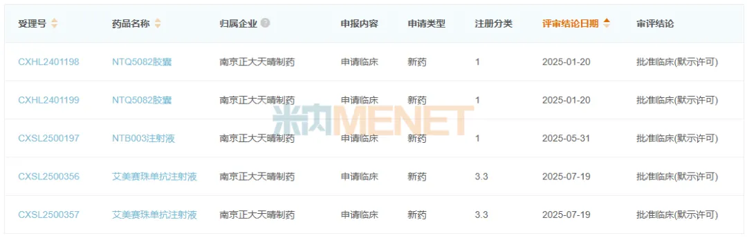 图1:南京正大天晴制药2025年获批临床的新药