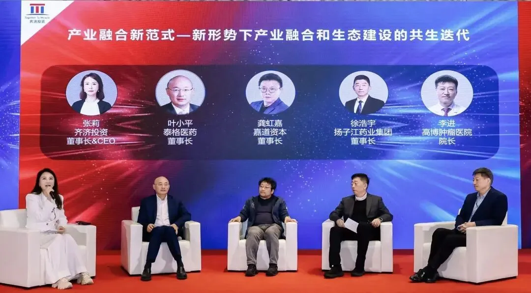 在主题为“产业融合新范式—新形势下产业融合和生态建设的共生迭代”的圆桌论坛中,齐济投资董事长兼首席执行官张莉女士与中国临床医药CRO领军企业泰格医药董事长叶小平,国内著名制药企业扬子江药业集团董事长徐浩宇,临床知名PI、高博肿瘤医院院长李进展开了深度交流。