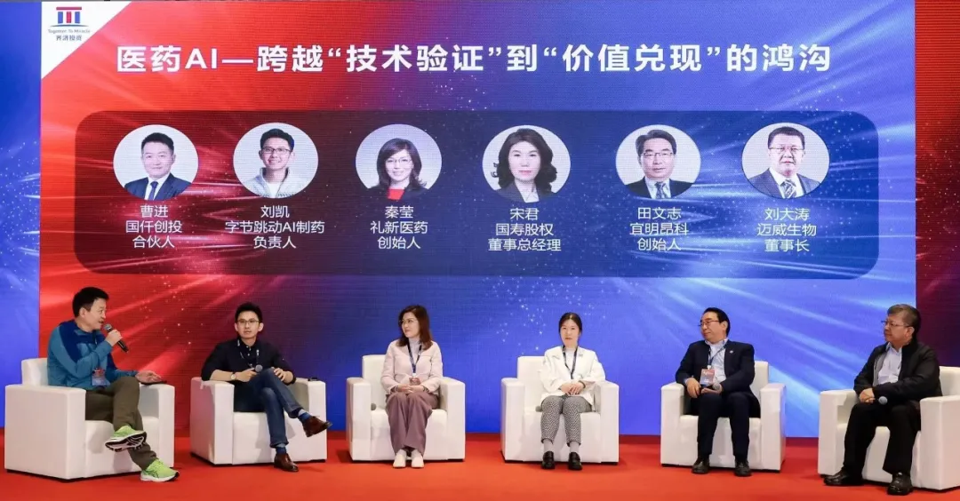 在主题为“医药AI—跨越‘技术验证’到‘价值兑现’的鸿沟”的对话中,字节跳动AI制药业务负责人刘凯,国仟创投合伙人曹进,礼新医药创始人秦莹,国寿股权董事总经理宋君,宜明昂科创始人田文志,迈威生物董事长刘大涛发表了真知灼见。