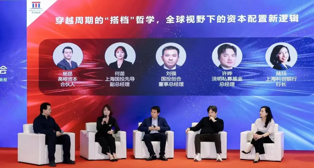 在主题为“穿越周期的‘搭档’哲学,全球视野下的资本配置新逻辑”的圆桌会议上,上海国投先导副总经理何苗,国投创合董事总经理刘强,高榕资本合伙人杨昆,淡明私募基金总经理许晔,上海科创银行行长陆珏共同参与讨论。