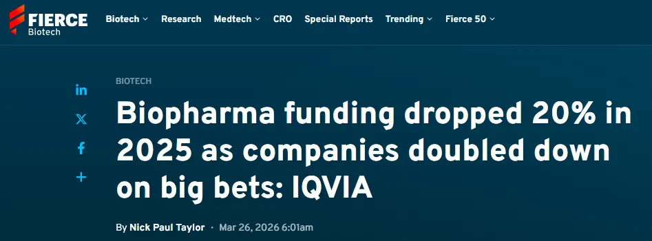 Fierce Biotech报道称,IQVIA发布的最新报告显示,2025年全球生物制药行业融资总额同比下降20%,从2024年的1020亿美元回落至820亿美元;全球IPO募资规模仅30亿美元,创下近十年最低记录。
