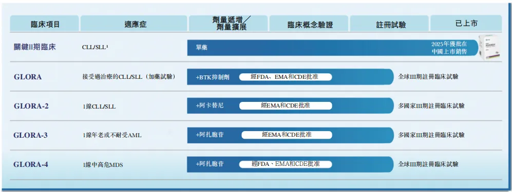 利沙托克拉正同步开展四项全球注册Ⅲ期临床研究,涉及经治CLL/SLL患者(GLORA研究)、初治CLL/SLL患者(GLORA-2研究)、新诊断AML患者(GLORA-3研究),以及新诊断中高危骨髓增生异常综合征(MDS)患者(GLORA-4研究)。