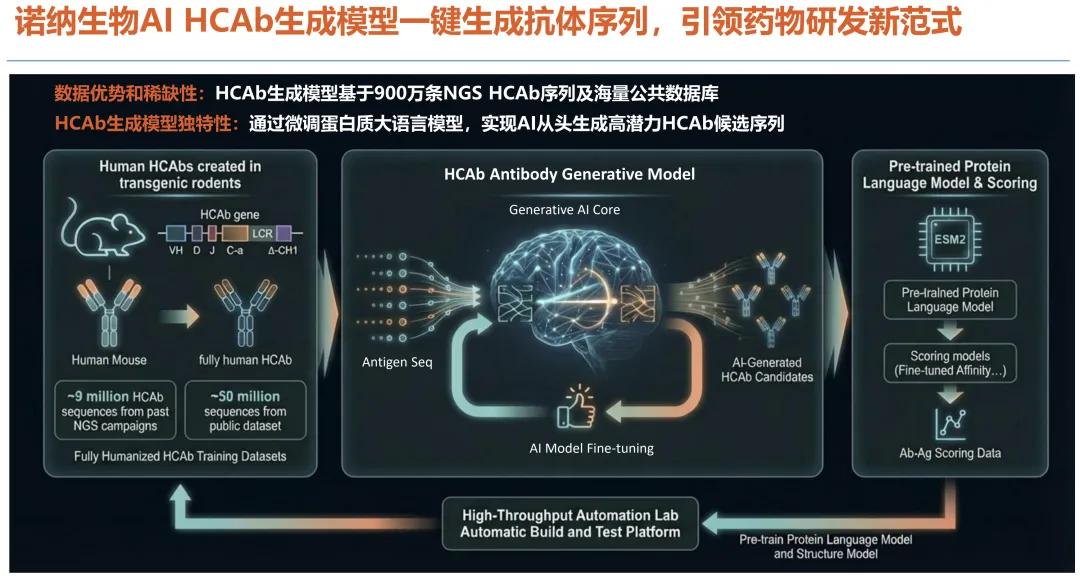 和铂推动AI与抗体工程技术的深度融合,AI平台合作已产生规模化收入。诺纳生物Hu-mAtrIx™AI平台将药物发现从传统盲筛模式升级为智能设计:通过融合生成式分子设计、数据驱动的优化算法与全自动湿实验验证,实现抗体研发全流程智能化,显著加速从IDEA到IND乃至临床开发的进程。