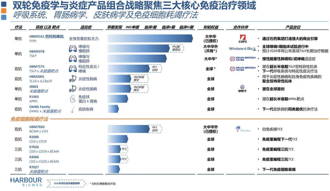 HBM9378(TSLP单抗)为全球第二个全人源TSLP抗体,半衰期较已上市的Tezepelumab长2-3 倍,支持3-6个月超长效给药,可减少注射频率并实现皮下给药,BIC属性显著。中重度哮喘全球II期临床由合作伙伴Windward Bio于2025年7月启动,中期数据预计2026Q3读出,慢阻肺全球II期临床预计2026Q2启动。