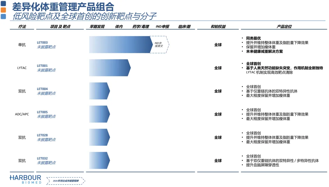 肌肉保护和长期体重维持,是当前减重领域巨大的未满足需求,和铂成立Élancé Therapeutics,开发下一代减重疗法,涉及单抗、双抗、ADC/APC、LYTAC(溶酶体靶向嵌合体)多种分子形式,旨在通过靶向激素调控和增强代谢调控的创新作用机制发挥治疗效果,有望与现有GLP-1单靶点/多靶点治疗方案相互协同,拓展肥胖症治疗边界。LET003是首个经Hu-mAtrIx™AI平台赋能并进入临床的分子,预计今年递交IND,增强并维持整体减重与减脂效果,同时保持瘦体重。LET001属于全球首创,基于人体遗传相关性证据的新靶点,通过LYTAC实现强效靶点清除。