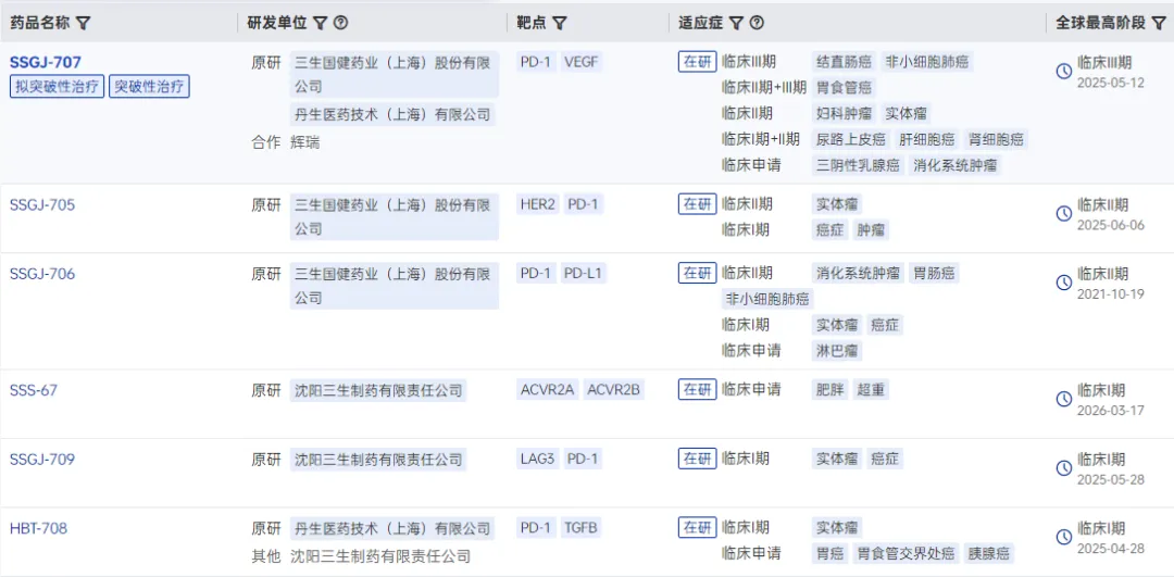 三生制药部分在研双抗候选药物