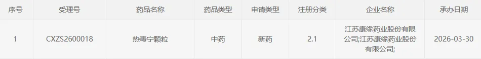 近日,CDE 发布公示:康缘药业的中药2.1类新药热毒宁颗粒上市申请获受理。