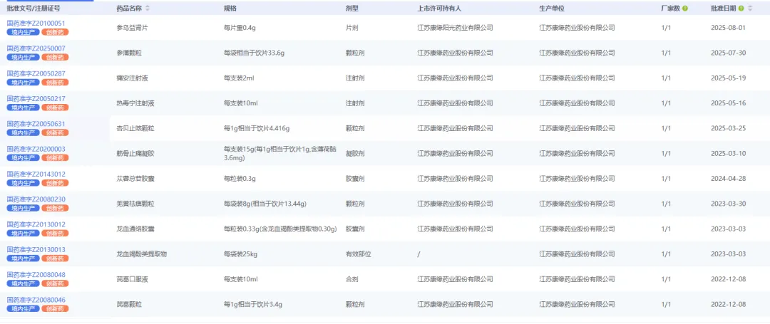 更为关键的是,其后续管线已进入密集兑现期。据梳理,目前康缘药业还有6款中药新药处于审批阶段,其中5款已经进入报产冲刺期,包括双鱼颗粒、青参通络颗粒、苏辛通窍颗粒、六味地黄苷糖片以及热毒宁颗粒。