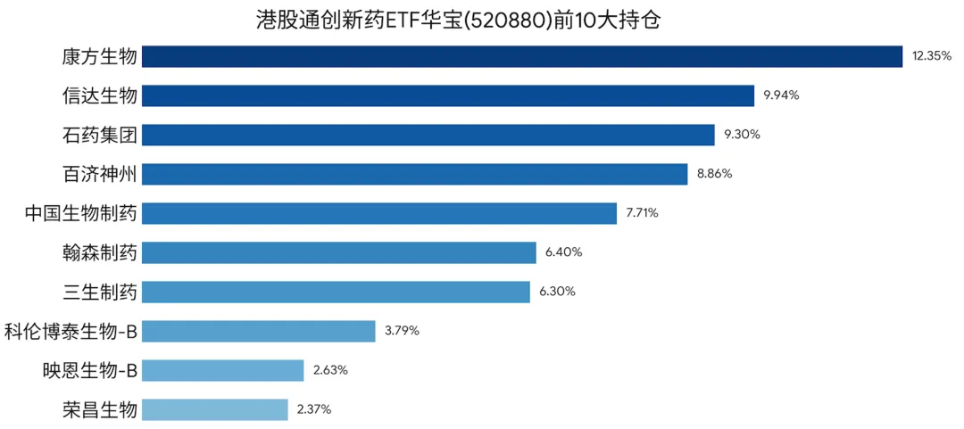 根据最新数据,港股通创新药ETF华宝(520880)目前持有约50家港股创新药公司,百济神州、信达生物、康方生物等核心创新药标的,都是其前5大重仓股。