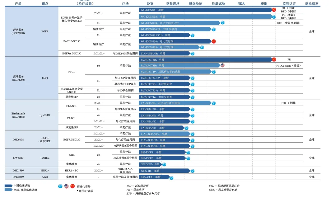 不同于多数创新药企仍停留在“海外授权”的浅层出海,迪哲医药的全球化,不仅全程自主推进,且多款核心管线已进入关键期。例如,舒沃替尼用于EGFR 20ins/PACC 突变 NSCLC 根治术后辅助治疗的III期临床(WU‑KONG16)、LYN/BTK双靶点抑制剂DZD8586 针对复发/难治慢性淋巴细胞白血病/小淋巴细胞淋巴瘤(r/r CLL/SLL)获FDA“快速通道认定”,并已开展国际多中心III期临床。