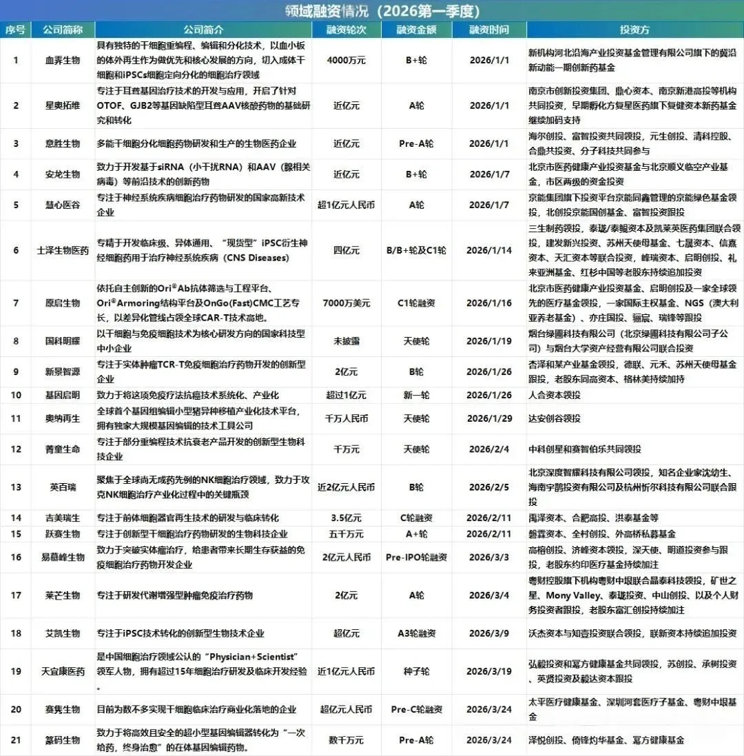 2026 年开年以来,中国细胞基因治疗(CGT)产业延续高景气发展态势,成为生物医药领域最受资本青睐的赛道之一。据企业公开披露及权威报道统计,今年 1-3 月,国内共有 21 家细胞基因治疗企业完成新一轮融资,总金额突破 25 亿元,其中亿元级融资占比近 70%,展现出行业强劲的发展活力。