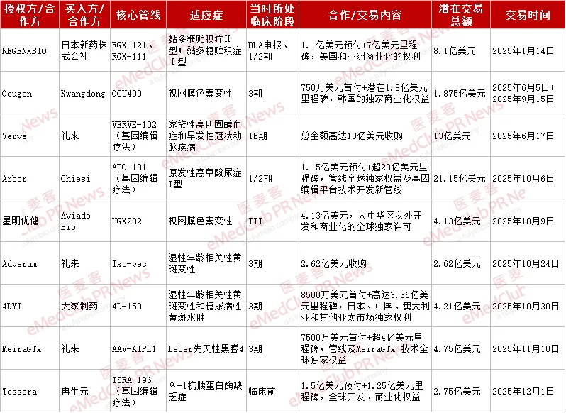 2025 年,基因治疗领域已发生 9 起主要 BD(含收购)事件,潜在总金额超 62 亿美元。礼来、Chiesi、再生元等知名药企纷纷出手,从单一管线引进到技术平台收购/合作,彰显出对基因治疗商业化潜力的强烈信心。