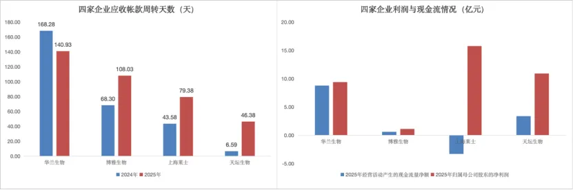 博雅生物同样处于失血状态,净利润从3.97亿元降至1.13亿元,经营现金流从3亿元骤降至0.61亿元,应收账款周转天数拉长至108.03天。
