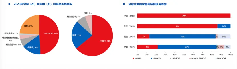 中国血制品市场的特殊性,恰恰在于其产品结构与全球主流市场显著错位。华创证券报告显示,中国市场中,白蛋白占比高达64%,静丙仅占23%;而全球市场则恰好相反,静丙及皮下注射免疫球蛋白占据近半壁江山,白蛋白仅占16%。这种结构倒挂意味着,中国企业的静丙产品在海外可能有广阔的空间。
