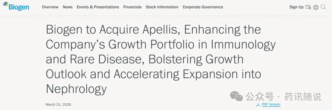 3月31日(当地时间),渤健(Biogen)宣布收购Apellis强化其自免和罕见病领域布局。