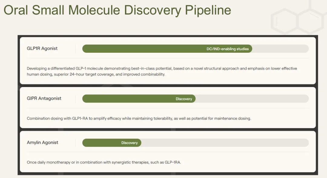 融资收益将用于:公司新型口服小分子GLP-1进入1期临床试验;继续开发公司的其他小分子项目,包括GIP和胰淀素(amylin)