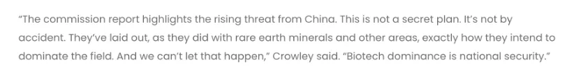 该报告声称,中国过去十年生物医药研发投入增长了400倍,并将中国正常的产业升级描述为“系统性挑战”与“国家安全威胁”。 Crowley称,“生物技术主导地位就是国家安全”,并呼吁全面落实报告提出的49项建议,以阻止中国取代美国成为全球生物技术领导者。