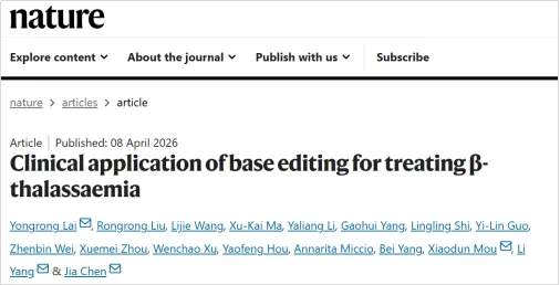 2026年4月8日,国际顶级学术期刊Nature在线发表了正序生物与广西医科大学第一附属医院、上海科技大学、复旦大学、上海临床研究中心的合作临床研究成果“Clinical application of base editing for treating β-thalassaemia”。该研究介绍了利用变形式碱基编辑器tBE(transformer Base Editor)开发的碱基编辑药物CS-101注射液治疗β-地中海贫血患者的IIT临床试验结果,5名β-地贫患者在接受治疗后,造血功能快速重建,总血红蛋白和HbF水平迅速提升且持续高水平表达,迅速摆脱输血依赖。