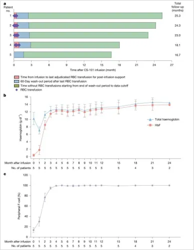 截至2025年11月17日,接受治疗的5例TDT患者均成功实现中性粒细胞和血小板植入,中性粒细胞和血小板植入的中位时间分别为16天(范围14–19天)和25天(范围13–50天)。所有患者均在治疗后1个月内(平均值16天)摆脱输血依赖;胎儿血红蛋白(HbF)和总血红蛋白水平显著升高并保持长期稳定;治疗后3个月,HbF浓度平均为11.5±0.9 g/dL,总血红蛋白浓度平均为12.4±1.0 g/dL;治疗后15个月,HbF浓度平均为12.9±1.6 g/dL,总血红蛋白浓度平均为13.4±1.8 g/dL。5例患者的中位随访时间为23个月,并均已完成至少15个月随访,且所有患者连续摆脱输血依赖超过12个月。随访期间,编辑效率在外周血和骨髓中保持稳定,未检测到脱靶编辑,未出现产品相关的不良事件。