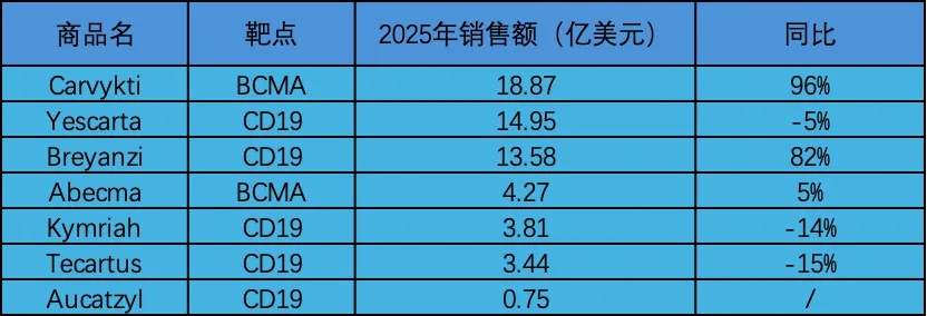若进一步拆分数据便会发现,CAR-T市场的分化已十分明显:2025年,销售额排名第一的Carvykti达到18.87亿美元,领先优势突出;而聚焦同一靶点的产品竞争中,“赢家通吃”的格局更为显著。